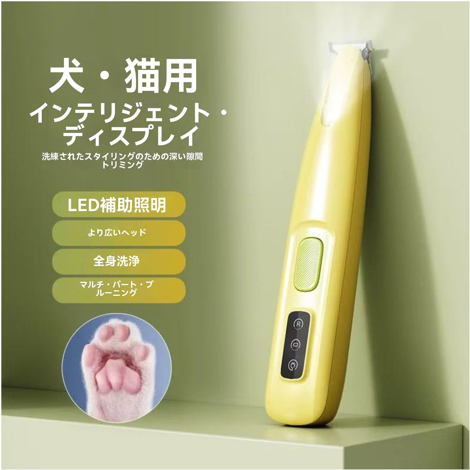 肉球の柔らかい皮膚に合わせた 0.5mm 極薄ブレードで、猫の細かい足毛から大型犬の太い毛までスムーズに処理。専用ガードコンパニオン付きで長さ調整可能(3-10mm)。 - 低騒音・低振動技術