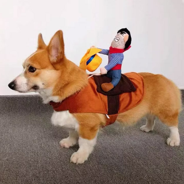 ペット用の衣装。コーギー用、面白いデザイン。ディーゼル(法斗)、ビビ(比熊)、テディ等のペット用。猫に変身するようなおかしなデザイン、デニムのライダー(騎馬)風の衣装。