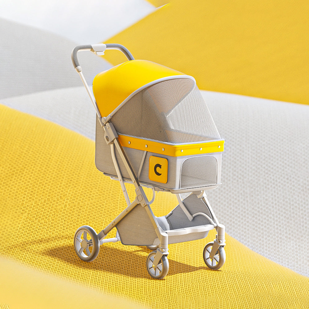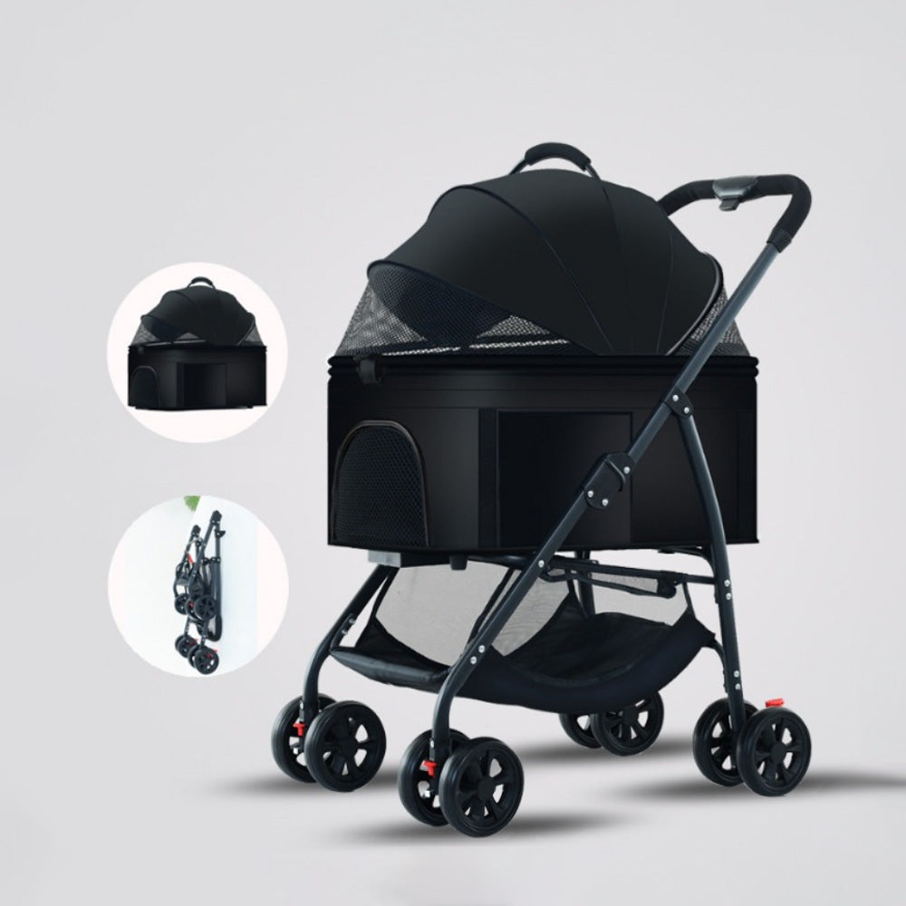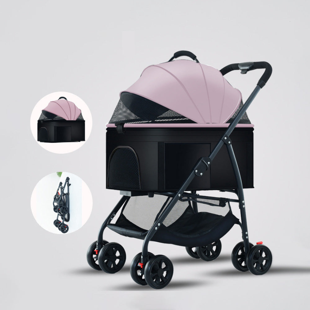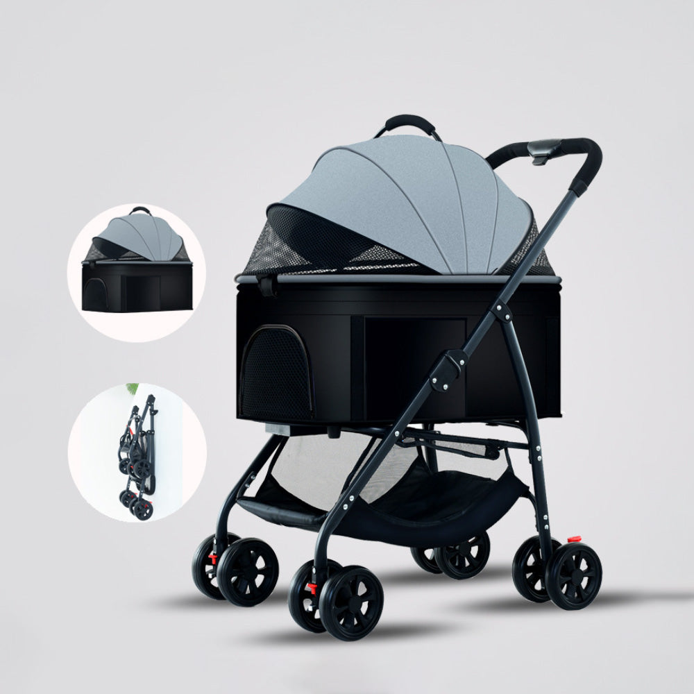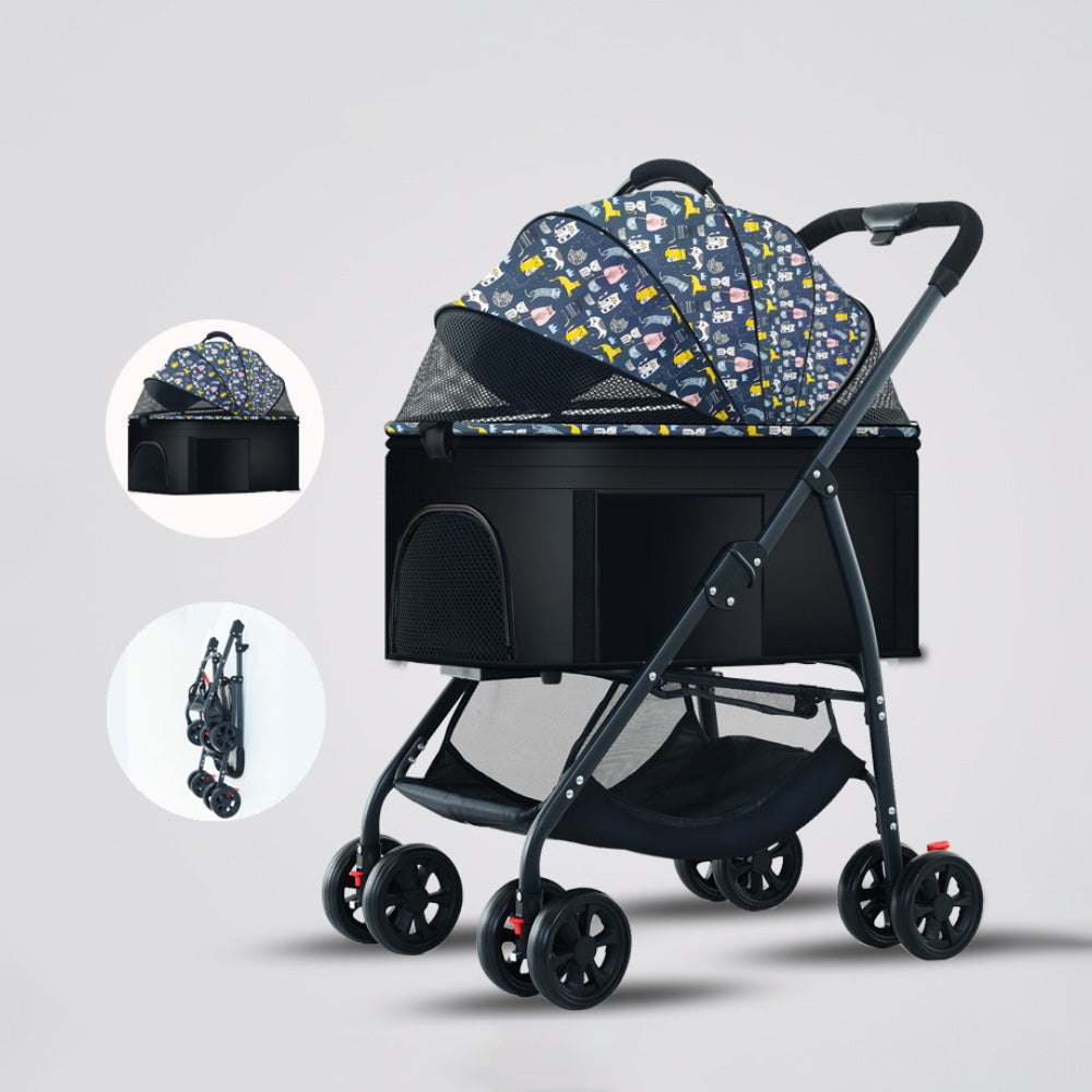 ペット用折りたたみ式軽量手押し車。中型や小型の犬や猫を連れて外出する際に最適な散歩用グッズです。