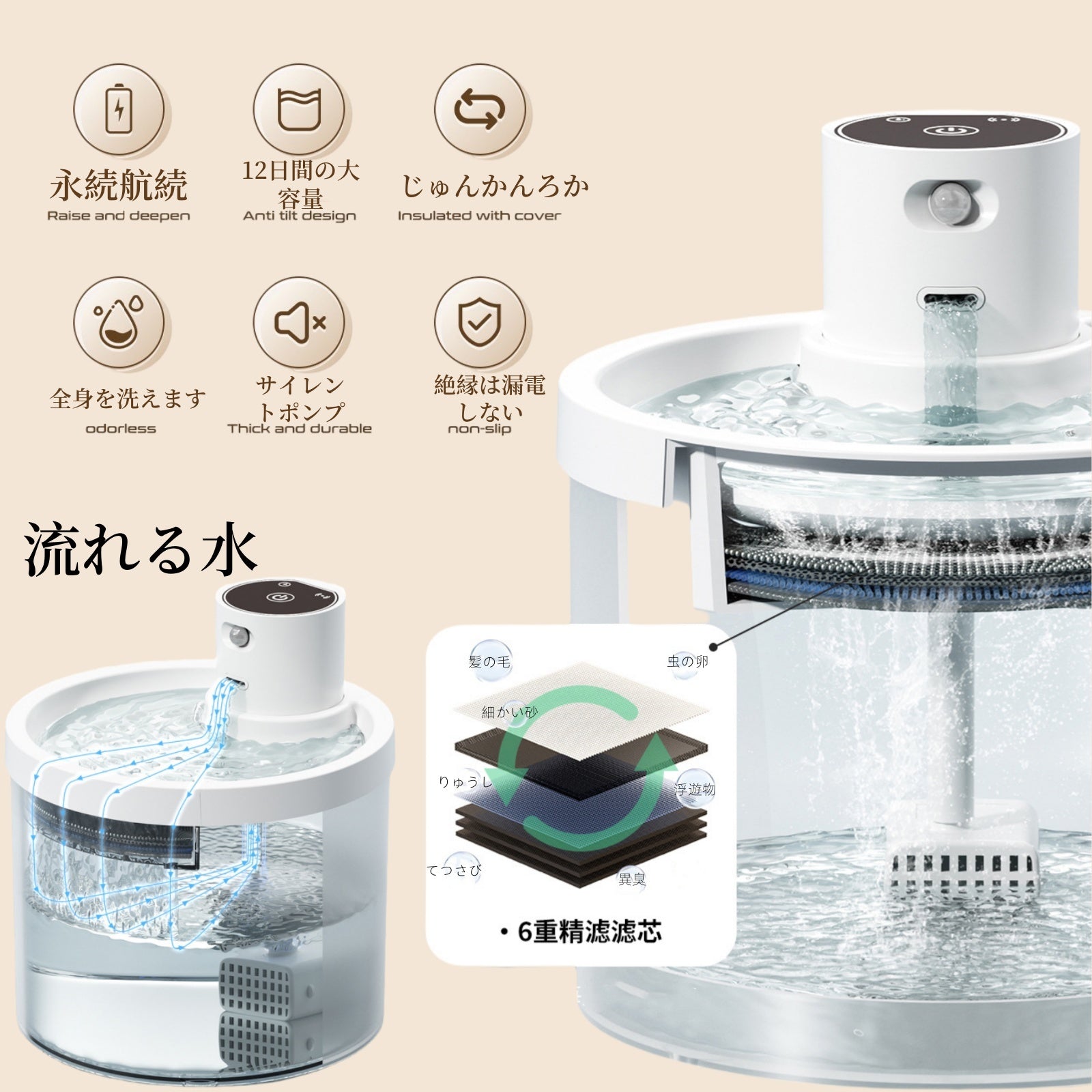 ✨ 衛生的な構造:フィルターによる浄水機能付きで、埃や毛髪を除去。分解洗浄可能な部品で定期的な清掃が容易。
